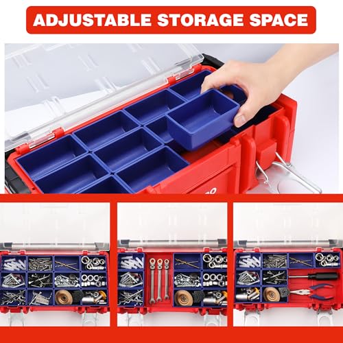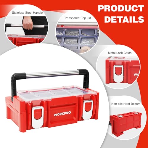 Specification: WORKPRO 17-inch Plastic Tool Box, Red Storage Box with Locking Lid and Stainless Steel Handle, 18 Adjustable Compartments for Sockets, Crafts and Power Tools, Great Father Day Gifts
