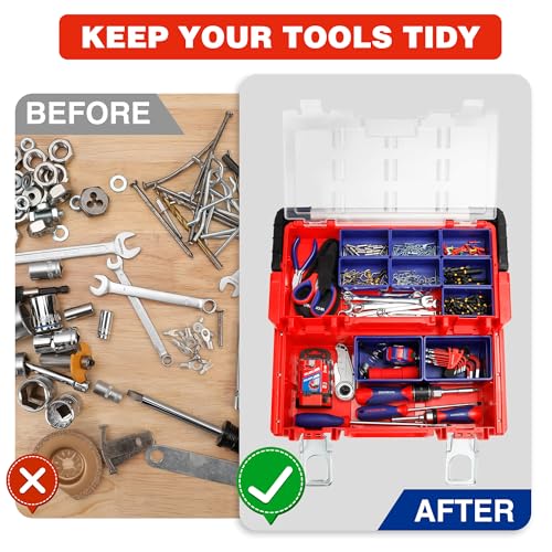 Movable Box with Lid: The tool box contains 18 movable compartments with a transparent cover. All compartments are easily put in and out to customize the storage case. The transparent lid allows you to see everything at a glance