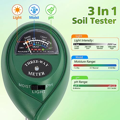 🌱3 IN 1 FUNCTION: This is a 3-in-1 multifunctional moisture meter.Our soil tester fastly to measure soil moisture, pH, and sunlight to help you take better care of flowers and plants. You can know when you need to apply proper water, fertilizer, and light to the plants by measuring the moisture and pH value of the soil, and the sunlight level of plants with it.