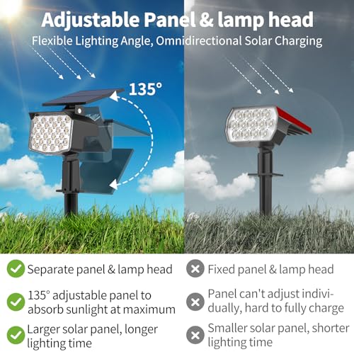 【Independently Adjustable Solar Panel】: The separate solar panel is vertically adjustable up to a maximum angle of 135° to absorb sunlight from full directions, and the lamp head is flexibly rotated up and down by 120°to achieve the desired lighting angle. Solar spotlights are equipped with 27 high-power LEDs, providing brighter and longer-lasting lighting than other competing solar lights. With a large monocrystalline silicon solar panel and built-in 1500mAh high-capacity battery, the energy conversion rate is as high as 25%, fulfilling the goal of highly efficient charging and all-night illumination