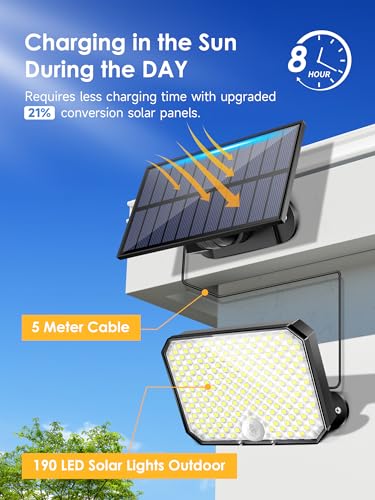 【Easy to Install & Split Solar Panel】190LED solar outdoor lights consists of two parts: solar panel and light fixture. The cable that connects the solar flood lights outdoor to the panel is very convenient, solar flood lights outdoor can be installed in two minutes. Solar flood lights outdoor, solar motion sensor light outdoor with 16.5ft cable, exposed to bad weather and is well waterproofed which lets you install the panel in the suitable sunny position. No high electric bills to pay.