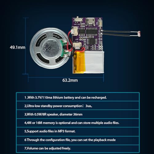 16 MB Storage Capacity : This sound module boasts a spacious 16 MB memory, providing ample storage space to accommodate multiple favorite songs or recordings. By connecting the module to a computer using a USB-Micro cable, you can effortlessly add new audio files to the internal storage. This opens up a world of possibilities for your creativity, allowing you to easily modify and update the stored audio content according to your preferences and needs.