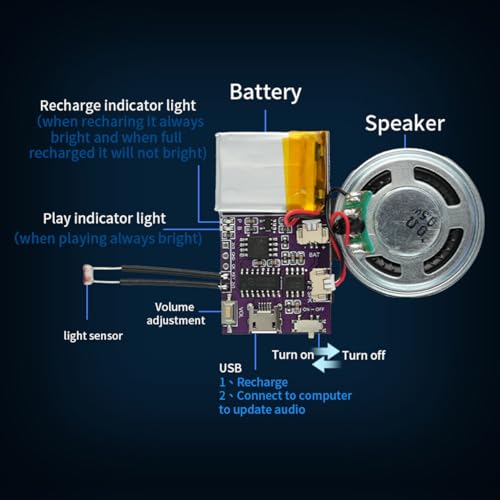 Specification: MP3 Music Sound Chips, Voice Module, Light Sensor Control Activated,16 MB Sound Module for Crafts, Christmas, New Year Greeting Cards, Box with Speaker Lithium Battery Powered USB Cable.