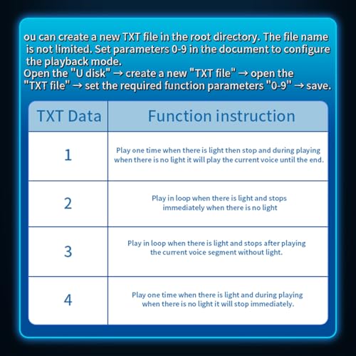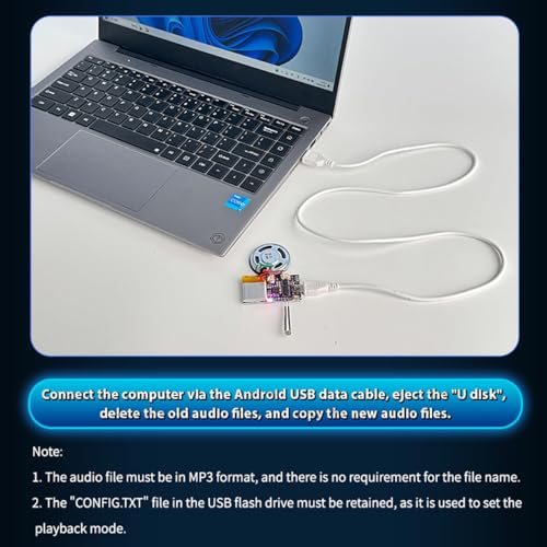 Download and Delete Music : The voice chips support download your own mp3 music, also record through MIC. You can connect to the computer to delete the built in music. Personalize your settings by adjusting the playback mode in the “config.txt” file. This allows you to achieve a personalized experience.
