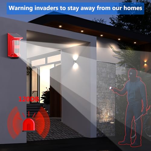 Solar Sound & Light Alarm Motion Sensor with 2 Remote Controls, 120DB Alarm Siren, Dual Detector and 3 Work Modes Flashing Warning Strobe Light for Home, Villa, Yard, Chicken Coop, Farm, Barn