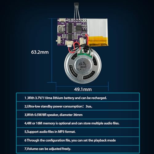 16 MB Storage Capacity : This sound module boasts a spacious 16MB memory, providing ample storage space to accommodate multiple favorite songs or recordings. By connecting the module to a pc The usage of a USB-Micro cable, You’ll effortlessly add new audio files to the internal storage. This opens up a world of possibilities for your creativity, allowing you to easily modify and update the stored audio content according to your preferences and needs.