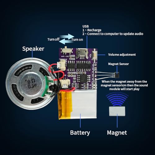 Specification: Voice Module, Magnet Sensor Control Activated MP3 Music Sound Chips, 16MB Sound Module for Crafts, Christmas, New Year Greeting Cards, Box with Speaker Lithium Battery Powered and USB Cable.
