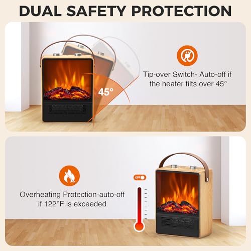 Double Safety Protection: Sensitive tip-over switch ensures that the mini fireplace heater auto shuts off if it is unintentionally knocked over. Built-in overheat protection sensor auto shuts the portable heater off when the internal heat reaches 212°F or above to prevent potential hazards.