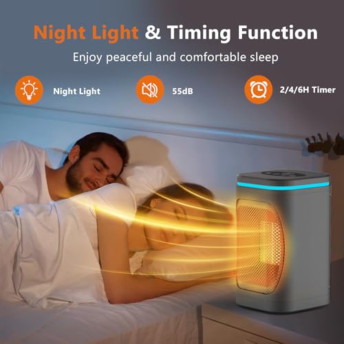 Colorful Night Lights & 2/4/6H Timer – The portable heater is equipped with colorful night lights, which are divided into color changing mode and monochrome fixed light mode, and will also be freely adjusted or turned off. Paired with 2/4/6H timers, it avoids discomfort caused by long-term use, creates a comfortable and relaxing sleeping environment. The unique design of the room heater can also reduce decibels, operate quietly, and won’t interfere with your work and sleep.