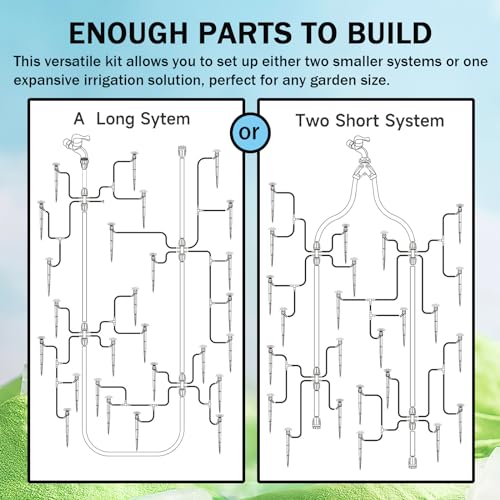 Upgraded Pipe Design – The main pipe of this automatic drip irrigation kits is upgraded to 1/2 inch diameter to support high water pressure. The 40-foot long main pipe can be cut into 2 main pipes, and we provide 2 faucet connectors in the package so that you can easily build 2 sets of watering system as needed