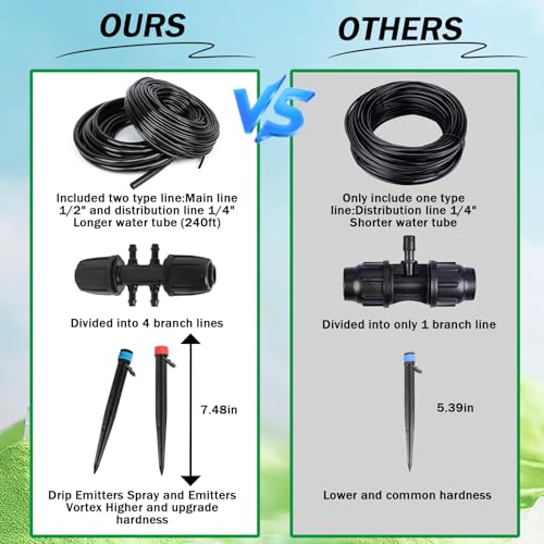 Specification: 240FT Drip Irrigation System Kit Automatic Irrigation System for Greenhouse, Yard, Lawn, Plant-Garden Irrigation System kit with 1/2 inch Hose 1/4 inch Distribution Tubing and Accessories