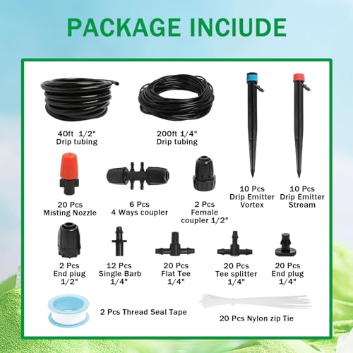 Drip Irrigation Kit-This garden irrigation system kit includes all of the accessories to form a drip irrigation system to meet your entire garden watering needs. The drip irrigation kit for garden includes 40 feet of main pipe (1/2 inch), 200 feet of distribution pipe (1/4 inch), a total of 147 parts, we provide enough accessories so that you can build 2 small drip irrigation systems or 1 longer irrigation system