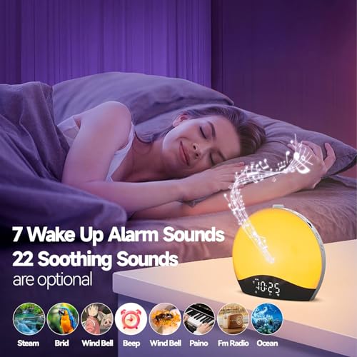 Specification: Sunrise Alarm Clock Wake Up Light, Kids Hatch Alarm Clock, Bluetooth White Noise Machine with 22 Soothing Sounds, 17 Color Night Lights, Sunrise Simulation, Dual Alarms, FM Radio, Snooze, Ideal Gift