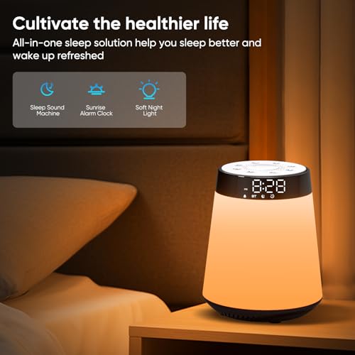 Sunrise Alarm Clock White Noise Sound Machine, 21 Soothing Sounds, 12 Dimmable Night Lights, Bluetooth Speaker, Wake Up Light Sunlight Alarm Clocks for Bedrooms, Heavy Sleepers, Adults, Baby, Kids