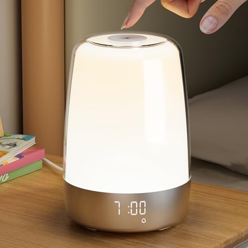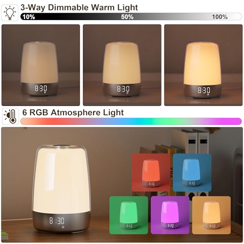3-Way Dimmable Night Lights: The touch control kids alarm clock with light allows you to easily adjust the 3-level brightness soft warm white and 6 colorful RGB lights (red, blue, green, purple, orange, cycle) to meet your different needs. Morning wake up light with alarm clocks for bedrooms, living rooms, An ideal gift for birthday, Hollywood, Christmas, etc.