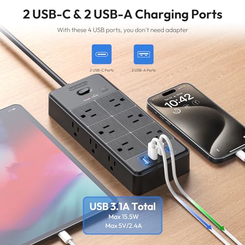 【2 USB C & 2 USB A Ports Extension Cord】- The power strip with 4 USB ports offers you more charging convenience and options, perfect for mobile phones, tablets, headphones, and other USB devices. No need for additional adapters anymore. The USB-C port is 5V/3.0A max and the USB-A port is 5V/2.4A max.
