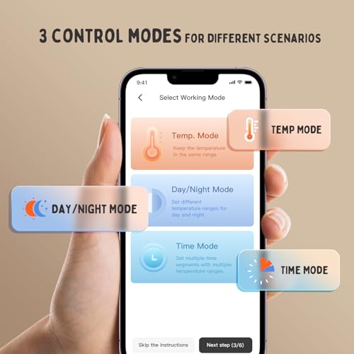 【Personalized mode settings】You’ll be able to set up to 12 periodic temperature ranges in a day the use of time mode. Two temperature ranges will also be set in day/night mode. When in temperature mode, simply set the start and stop temperatures to run automatically.