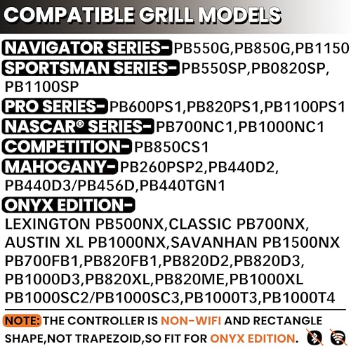 Wide Compatibility:This grill thermostat controller fits a wide range of Pit Boss models, including Navigator Series, Sportsman Series, Pro Series, NASCAR Series, and more. Ensure compatibility with most Pit Boss wood pellet grills and smokers