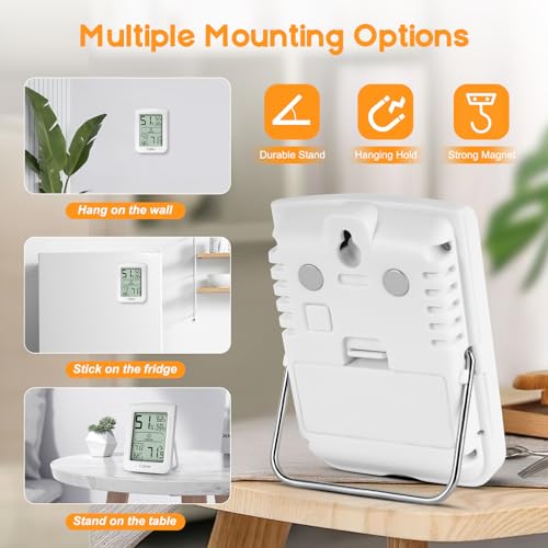 This indoor temperature and humidity meter has a desktop stand and a built-in magnet design on the back, which can place the temperature monitor on any flat surface or refrigerator