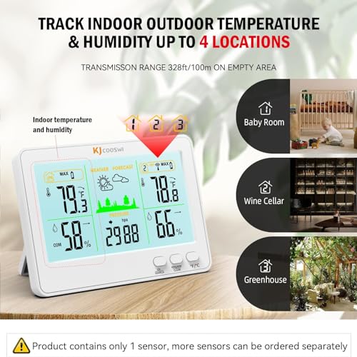 【Up to 328ft/100m Wireless Remote】: This weather station supports up to 3 thermometer sensors to monitor different locations (1 sensor included, additional sensor can be ordered separately). Thermometer indoor outdoor can get the temperature and humidity records from 326ft/100m remote range away in open areas, making you easily know your surrounding climate condition.