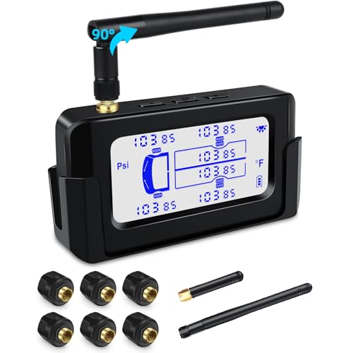 Specification: Tire Pressure Monitoring System 3.15” Wireless Solar RV TPMS Tire Pressure Monitor System Signal Booster Antenna 66 ft with 6 Sensors for Travel Trailer Truck Fifth Wheel Motorhome 0-130 PSI