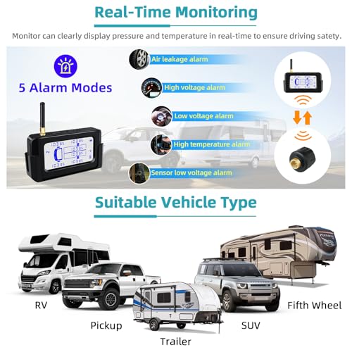 5 Alarm Modes & Toughen Multiple Cars – Tire pressure monitoring system supports high and low pressure/fast leak/high temperature/sensor loss alarms, provides sound and light prompts, and updates in real time. The maximum working distance of 66ft and the maximum pressure value of 130PSI bring stable signal transmission and longer service life, supporting multiple vehicles, RV/Go back and forth Trailer/Truck/Fifth Wheel Motorhome, etc.