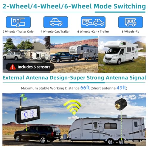 Enhanced Signal Antenna – TPMS external enhanced signal antenna supports a maximum working distance of 66ft, and can be updated stably in real time even when driving at high speed. Newly added 2/4/6-wheel mode supports multiple usage scenarios such as 2-wheel trailer/4-wheel trailer/4-wheel tractor + 2-wheel trailer, and can be quickly switched. Switch between 4/6-wheel mode for long-distance Go back and forth. (Default 6 sensors, Maximum working distance: 66ft for long antenna, 49ft for short antenna)