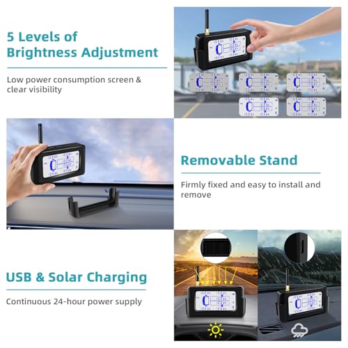 Versatile & Convenient – RV tire pressure monitoring system Supports 5 levels of brightness adjustment, the screen is clearly visible under the scorching sun and not dazzling at night. The detachable bracket means that you can easily remove the monitor for setup or charging. There are two charging methods: USB and solar. Normally, you’ll be able to charge for a minimum of 3 hours before the first use, and then you’ll be able to continue to use it through solar energy without having to use a USB cable to charge it again.