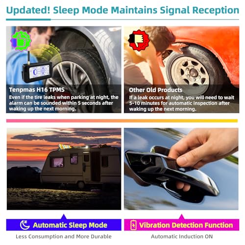 Upgrade! Real Time Update During Sleep & Intelligent Automatic Sleep Vibration Sensing – First tpms tire pressure monitor system on the market with real-time update function during sleep, monitoring tires without missing any moment. If the old TPMS leaks at night, you can only wait for the display to self-check for 5-6 minutes in the morning to update the value. Tenpmas H17 fixes this defect, even if the tire changes during sleep, the display can be updated in real time after waking up.