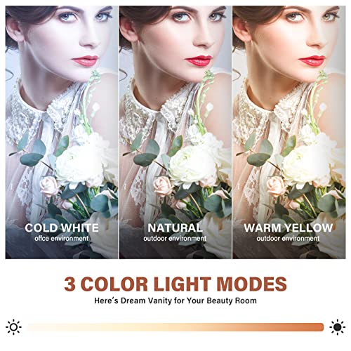 【3 Color Light Settings】The Hollywood makeup mirror designed with multiple choices of colour temperature ranging fromswitch warm light, natural and cold light, the brightness can be ceaselessly adjusted to dark or bright, which is meet your different makeup needs