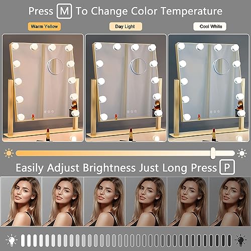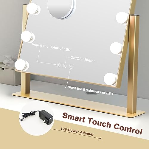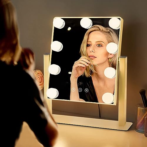 Specification: Depuley Vanity Mirror with Lights Hollywood Mirror Light, 12.0″×13.77″ Lighted Vanity Mirror with 9 Dimmer Led Bulbs, 3 Color Modes, Touch Control, Detachable 10x Magnification, 360° Rotation, Gold