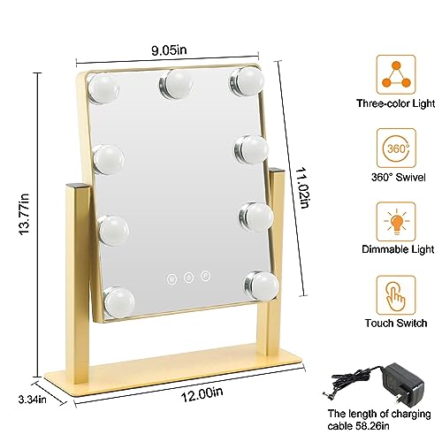 Depuley Vanity Mirror with Lights Hollywood Mirror Light, 12.0″×13.77″ Lighted Vanity Mirror with 9 Dimmer Led Bulbs, 3 Color Modes, Touch Control, Detachable 10x Magnification, 360° Rotation, Gold