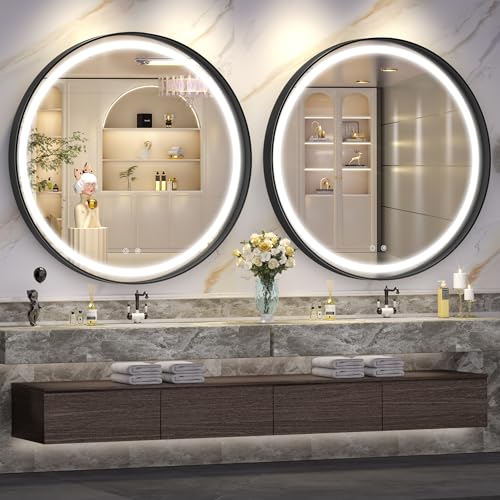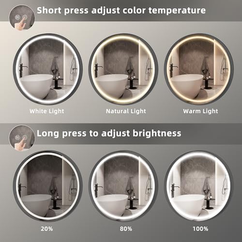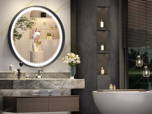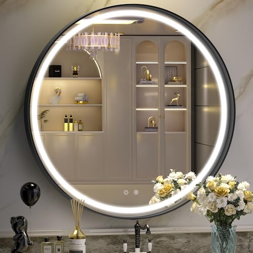 Specification: Hasipu 30” LED Bathroom Mirror with Light, Round Black Metal Frame Bathroom Mirrors for Vanity Anti-Fog, Dimmable, 3 Colors