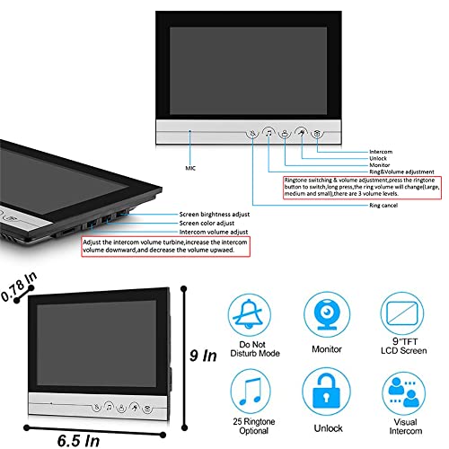 Specification: 9inch Wired Video Intercom System with Camera and Monitor Doorbell,Doorbell Camera with Monitor Supports Unlocking,Monitoring,Dual-Way Intercom for Villa Home Office Apartment