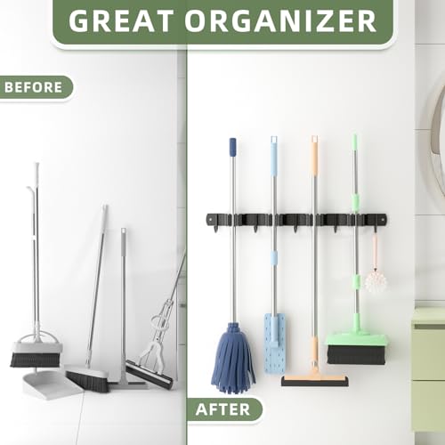 Wildly Application: Broom and mop organizer wall hanging is an idea tool organizer for bathroom, closet, garage, kitchen, laundry room storage, perfect for hanging mops, brooms, rakes, shovels, repair tool, umbrella, kitchen supplies, toilet brush and so forth, bettering home storage space, keeping your house tidy.