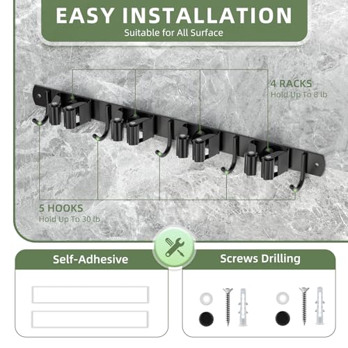 Easy Installation: The broom hangers for wall have two ways of installations for different surfaces, you’ll be able to easy to stick the mop holder in the self adhesive way for smooth surface, and screw drilling for the rough surface, it is suggested the screw drilling for weighty or outside hanging.