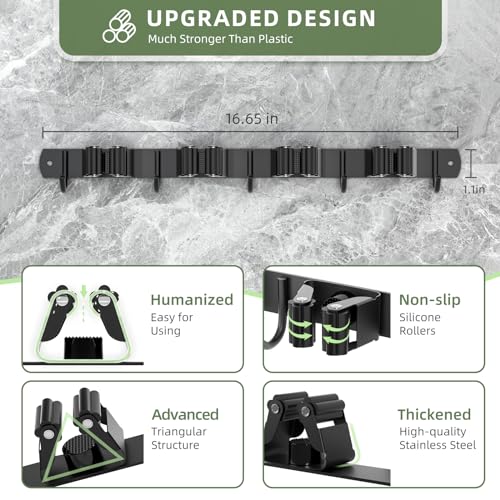 Super Anti-Slip: The mop holder wall mount is designed with advanced triangle structure and soft silicone rollers, the broom organizer can provide strong grip, No need to worry about the broom and dustpan falling off after being stained with water.