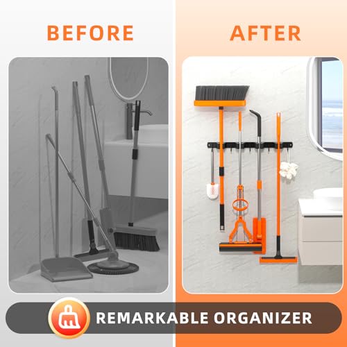 【Remarkable Organizer】DOMAXCAI new version broom holder wall mount is designed with 4 racks and 5 hooks, and each broom organizer have two ways of installation, suitable for all surface, you can easily tidy up piled brooms, mops, brushes, dishcloths, rakes, garden tools and more, get your home & life in order, let you have a more comfortable living space.