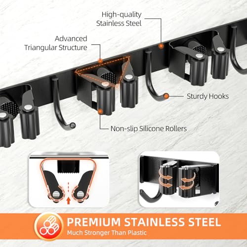 【Super Anti-Slip Design】Our mop holder wall mount is designed with advanced triangle structure and soft silicone rollers, provided strong grip, No need to worry about the broom and dustpan falling off after being stained with water.