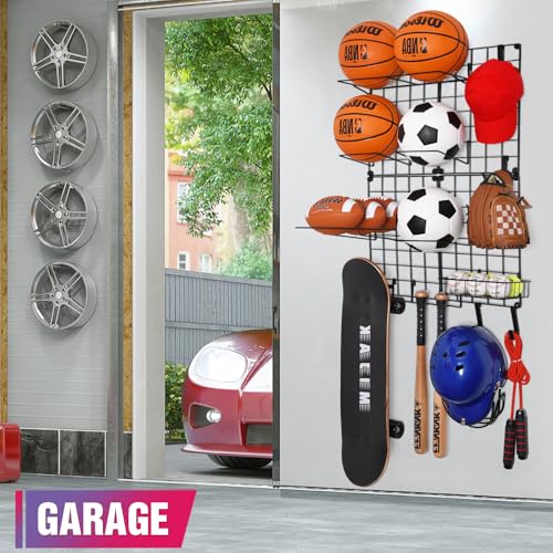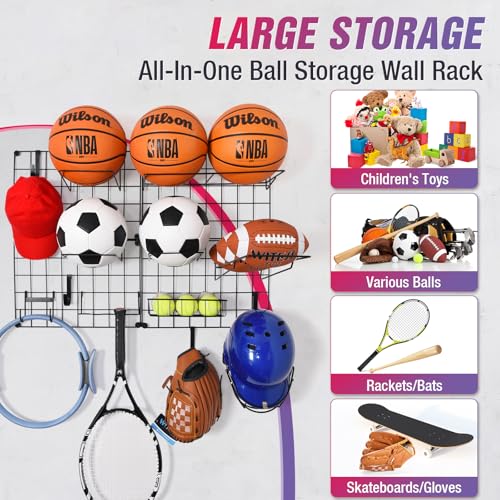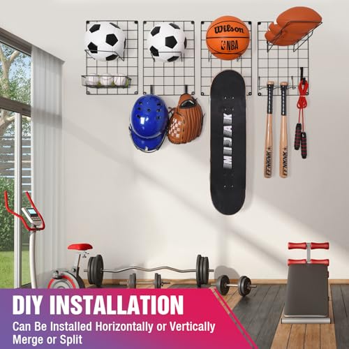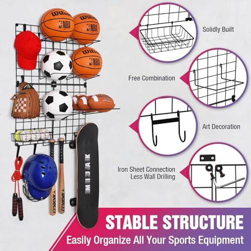 🏀【Multi-function Garage Wall Organizer】Perpect for organizing all kinds of sports gear.The ball storage rack comes with 4*Metal Back Grid, 5*ball frame, 1*basket and assortment of hooks.Can hold basketballs, footballs, soccer balls, Baseballs, volleyballs, tennis, helmets, Gloves, skateboard, Baseball bat,Tennis racket and even your kids’ toys storage and beach supplies.