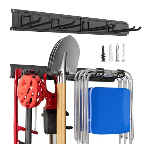 Specification: Garage Garden Tool Organizer Wall Mount, Heavy Duty Garage Tool Storage Rack 32 Inches, Max Load 220lb – Shovel, Rake, Folding Chair, Weed Eater Storage