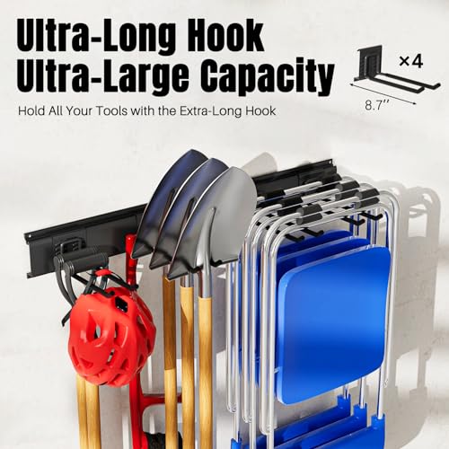 Maximum Capacity: With four extra-long hooks and two rails, this garden tool organization is a storage powerhouse! From shovels to rakes, folding chairs to ladders, weed eaters to power drills, even skis and snowboards – there may be room for the whole thing!