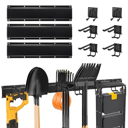 Specification: Garage Organization Garage Wall Organizer-Garage Tool Organizer Wall Mount 48in with Adjustable Metal Hooks,Max 440Lbs Yard Tool Organizer,Garden Tool Storage for Shovels Broom Folding Chair,Black