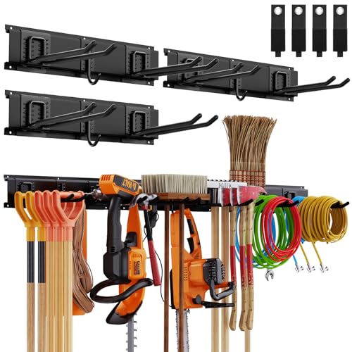 EVERYTHING IN ITS WALL PLACE: Our versatile tool storage rack accommodates quite a lot of items, including garden tools, shovels, rakes, brooms, mops, extension cords, hoses, power tools, chairs, ladders, and sporting equipment. Effectively optimizing your storage space whilst keeping everything easily accessible and organized.