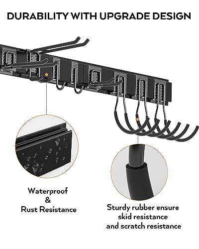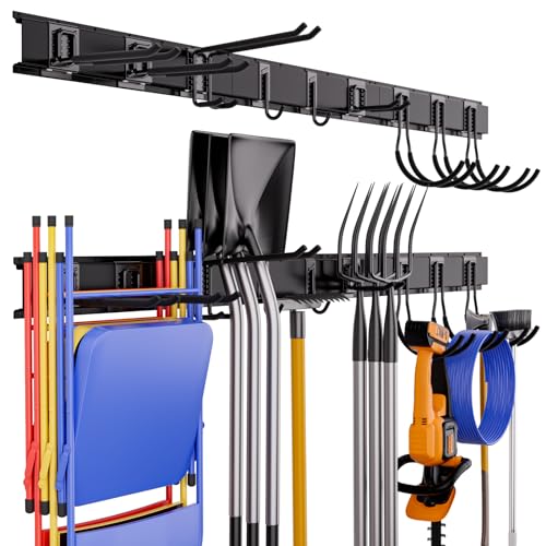 MAXIMIZE SPACE EFFICIENCY: The garage storage rack is ideal for hanging a wide range of tools such as yard tools, shovels holder, rakes, brooms, hoses, power tools, folding chairs, ski gears, and so on. Widely use in garden, garage, utility room, basement or shed