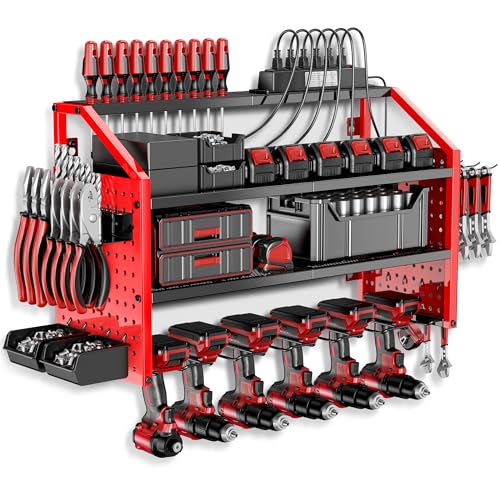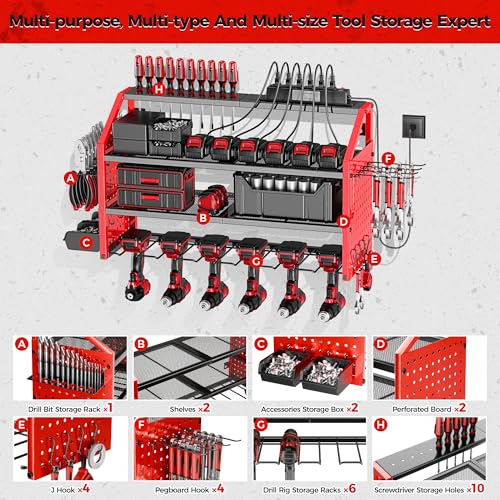 Specification: LBT Power Tool Organizer Wall Mount with Charging Station. Patented, Heavy Duty Steel, Garage 6 Drill Storage Shelf, 8 Hooks,2 Screw Boxes,6 Outlets Power Strip, Easy Install Power Tool Storage Rack.