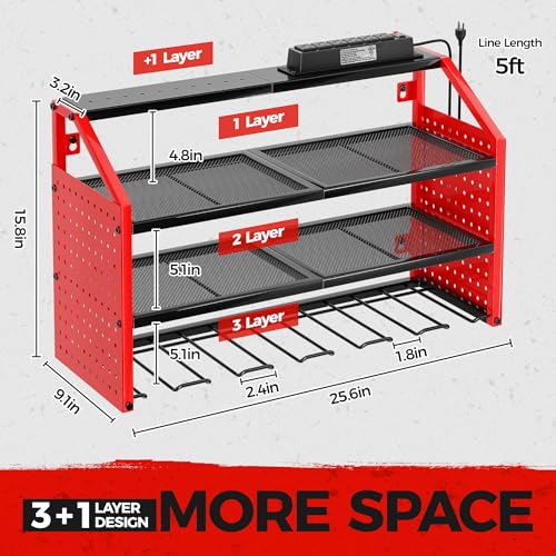 【All Garage Tool Storage Station】This wall-mounted tool holder come with 4 slots, 4 hooks and 6 drill bit rack, Built-in power strip, You’ll store your charging stations, batteries, toolboxes, drill bits, hammers, And other garage tools, Keep tools organized within the work area and save your bench space,Amazing christmas or father’s day gift for men