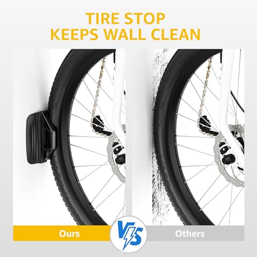 【Upgraded 150° Swivel Design】 Swivel design with bearing system, swivel bike rack wall mount conveniently stores bikes in center, left or right-angled position, making it a convenient storage solution around parked cars and inside apartments. The swivel system allows you to store bike flush against the wall. Just hook the front wheel in place, rest the back wheel on the stabilizer, and then rotate the bike wall hanger to the desired angle.