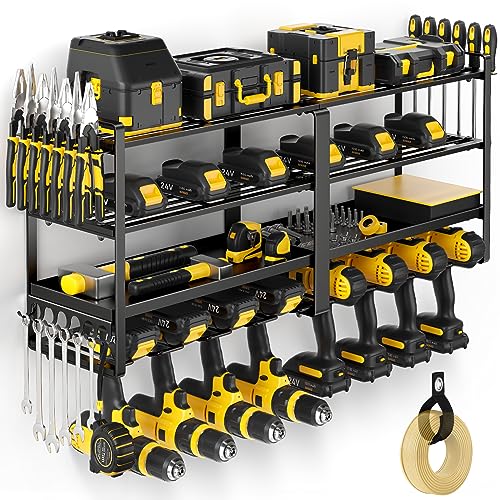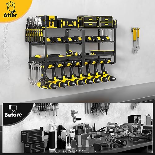 【Extra Large 8 Drill Holders and 4-Layer Capacity】- This power tool organizer wall mount is designed to store 8 cordless drills at the bottom tier, with three additional layers for storing heavy tools, small accessories, and added slots for hammers, pliers, and screwdrivers. It is the easiest solution for organizing your cordless tool organizer needs.