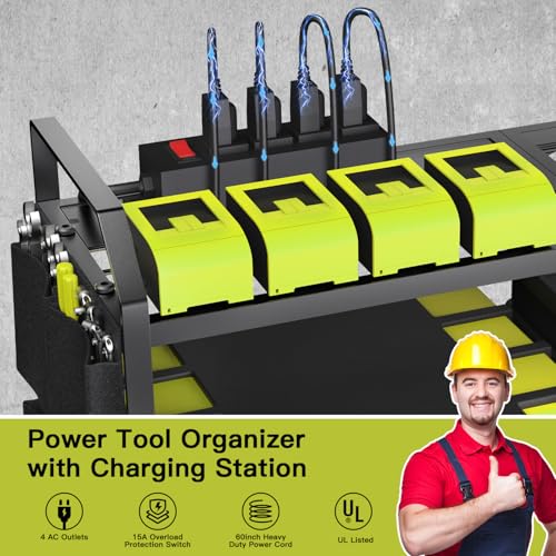 UPGRADED DESIGN: The power tool organizer wall mount adopts the recent high-capacity design, the height of the mid-tier shelf is 7 inch, which is sufficient to place more large tools. But even so, Attached power strip has overload protection, which is UL and FCC certified, you’ll charge everything right in the rack and keep away from looking for sockets